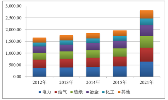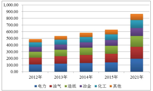 全球混凝剂和絮凝剂在工业/生产水处理应用领域保持增长。2015 年,电力、油气、造纸、冶金、化工、其他行业市场需求分别为 7.95 亿美元、4.95 亿美元、4.10 亿美元、 2.85 亿美元、 2.45 亿美元、 2.55 亿美元, 预计 2021 年分别达到 11.40亿美元、 7.15 亿美元、 5.80 亿美元、3.95 亿美元、3.40 亿美元、3.65 亿美元。